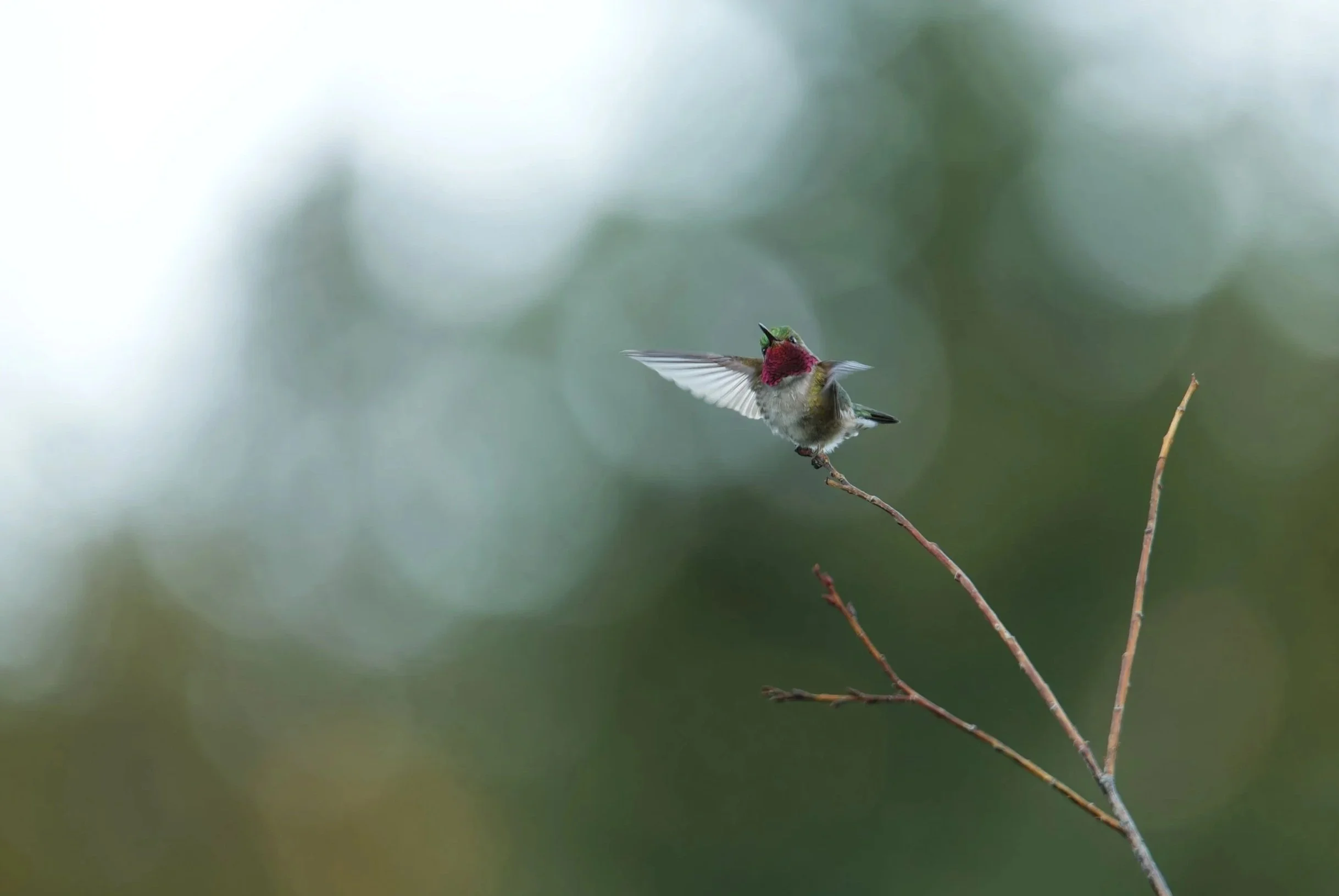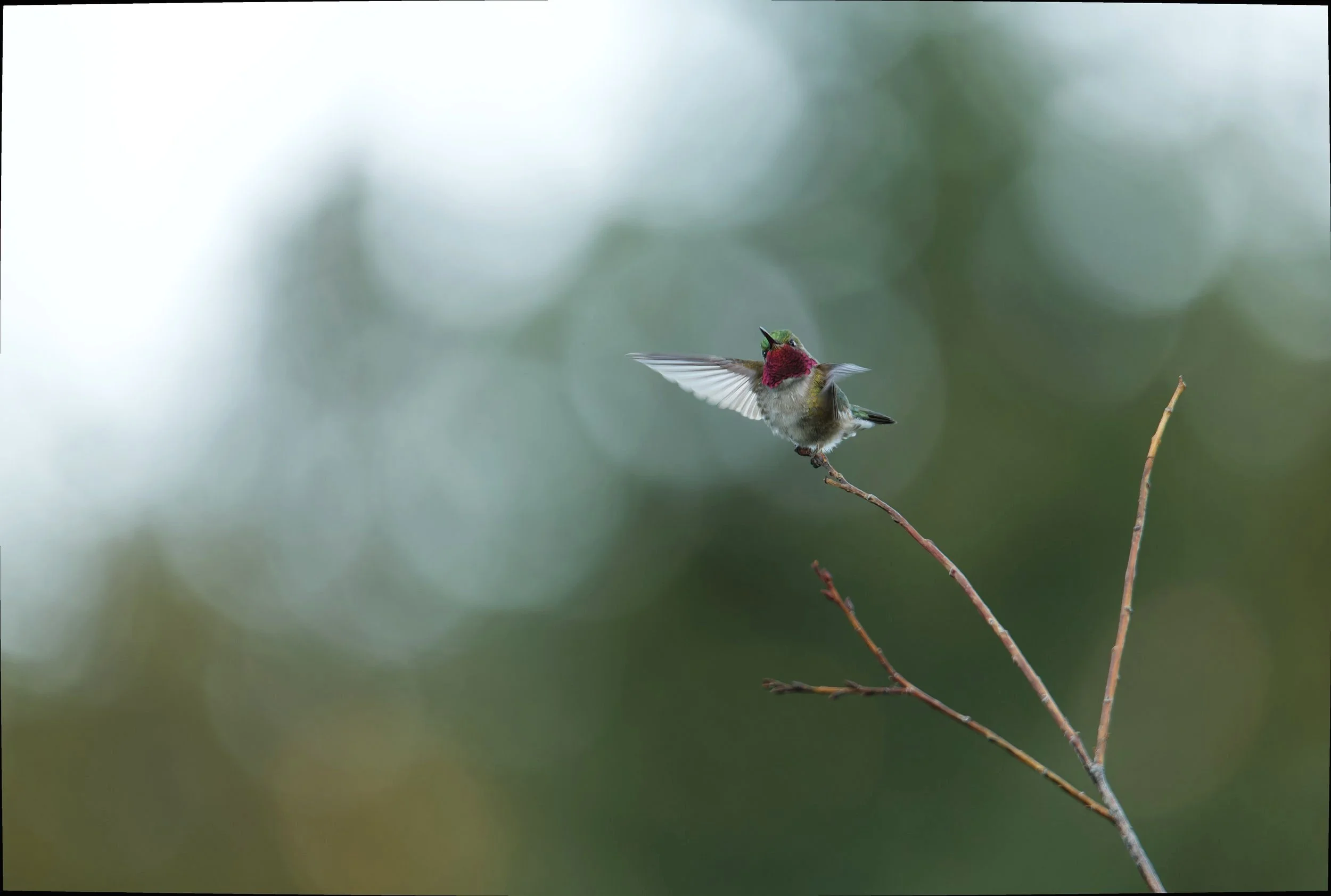 July 2023 - Breckenridge, CO - During a dusk hike looking for the Red Fox, I couldn’t help but hear the whizzing and humming above my head, only to discover a primal dance of color and defense. The Ruby Throated Hummingbirds would rise and fall in a U shape defending their territory, reaching massive heights off the ground barreling down to their perch on the near by trail.